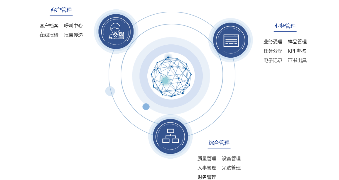 - 不仅实现实验室样品受理业务的全流程信息化管理,还可同步实 现质量、人事、财务、采购、行政、销售等其他部门的全程信息 化管理。