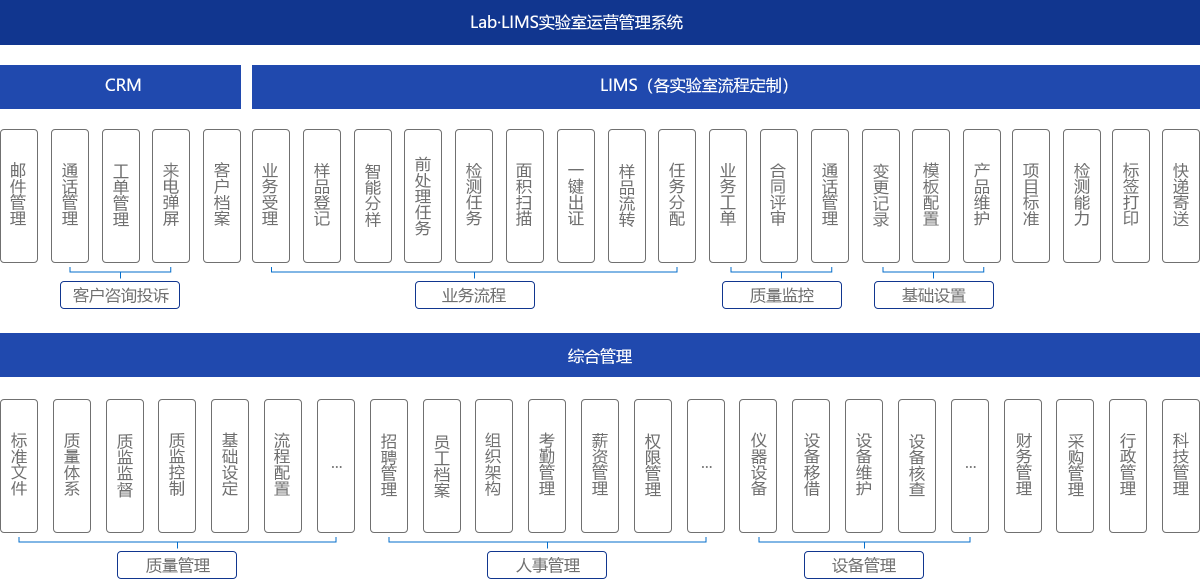 Lab·LIMS是由普若飞团队结合自身三十多年的实验室运营管理经验开发的新型广义的LIMS系统。该系统包含客户关系管理、业务管理、综合管理以及系统管理四大版块,数十个功能模块,数百项便捷功能,能够帮助实验室实现运营管理全过程的规范化、信息化、精益化管理。目前,实验室运营管理系统Lab•LIMS系统已成功应用于多个国家重点实验室运营管理项目,协助客户轻松管理百人规模实验室,高效完成5万批次年检测业务,同时解决了提升客户体验、体系认证、质量控制、人员管理、设备管理、科研创新等全方位的实验室管理痛点。